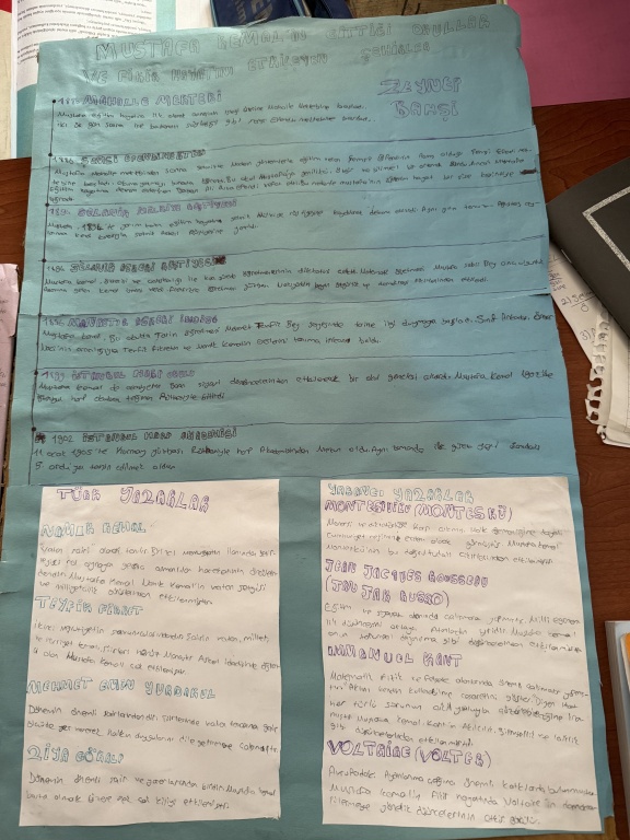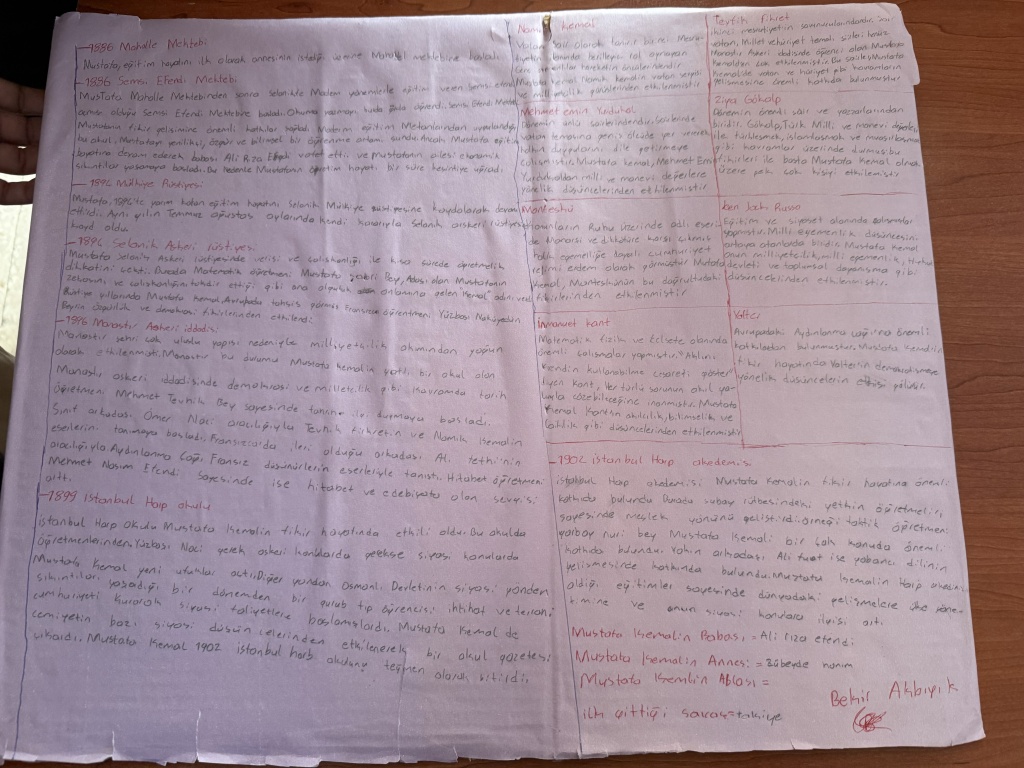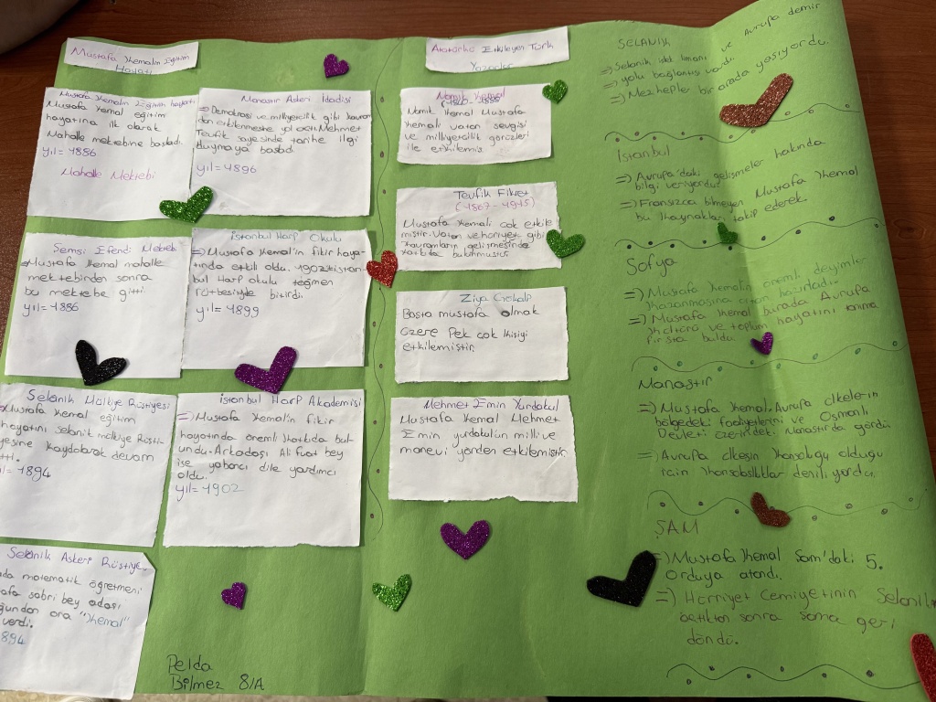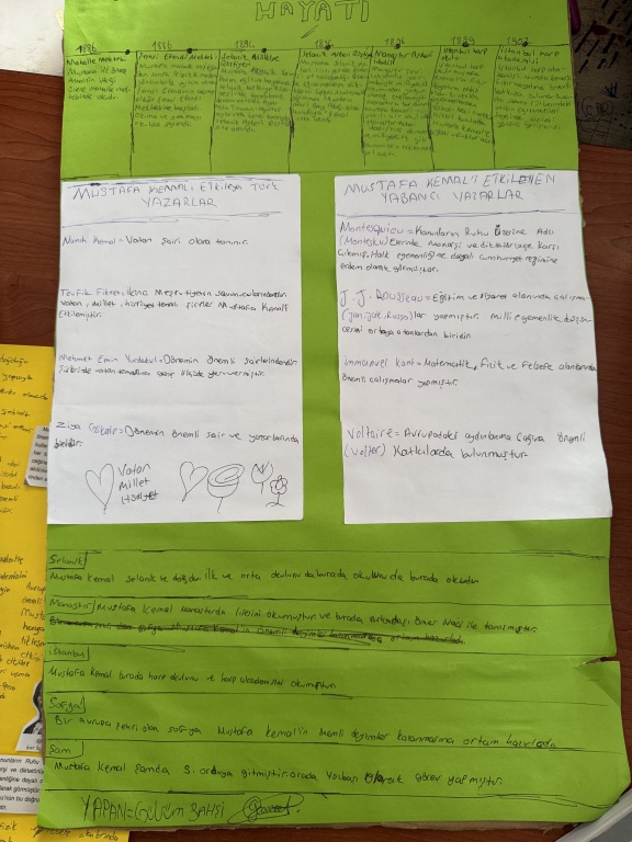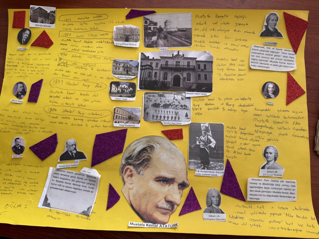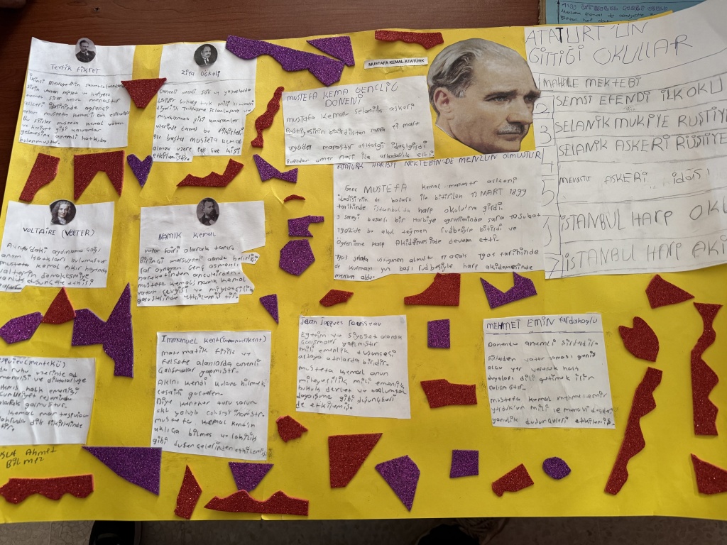 8/A sınıfı öğrencileri, T.C. İnkılap Tarihi ve Atatürkçülük dersi kapsamında “Mustafa Kemal’i etkileyen yerli ve yabancı yazarlar, yaşamını etkileyen şehirler ve öğrenim gördüğü okullar” konulu bir çalışma yaptı.