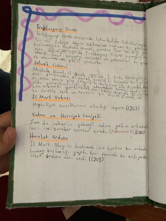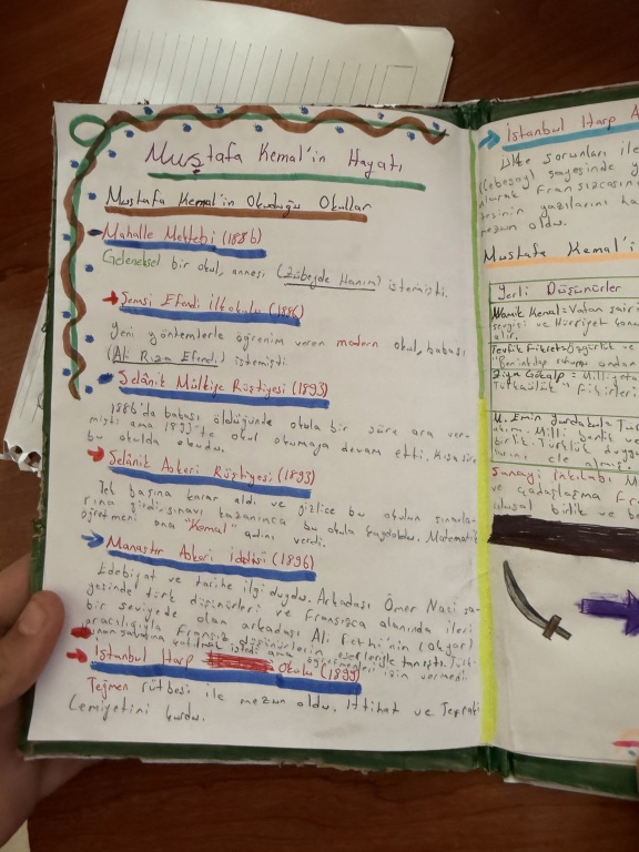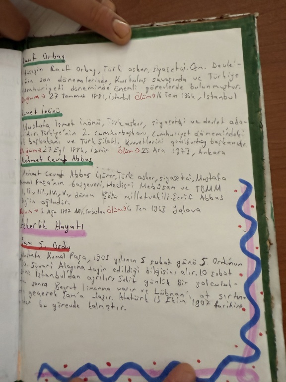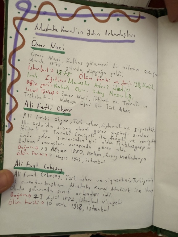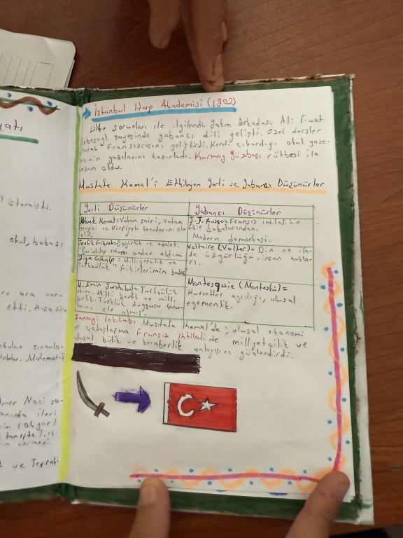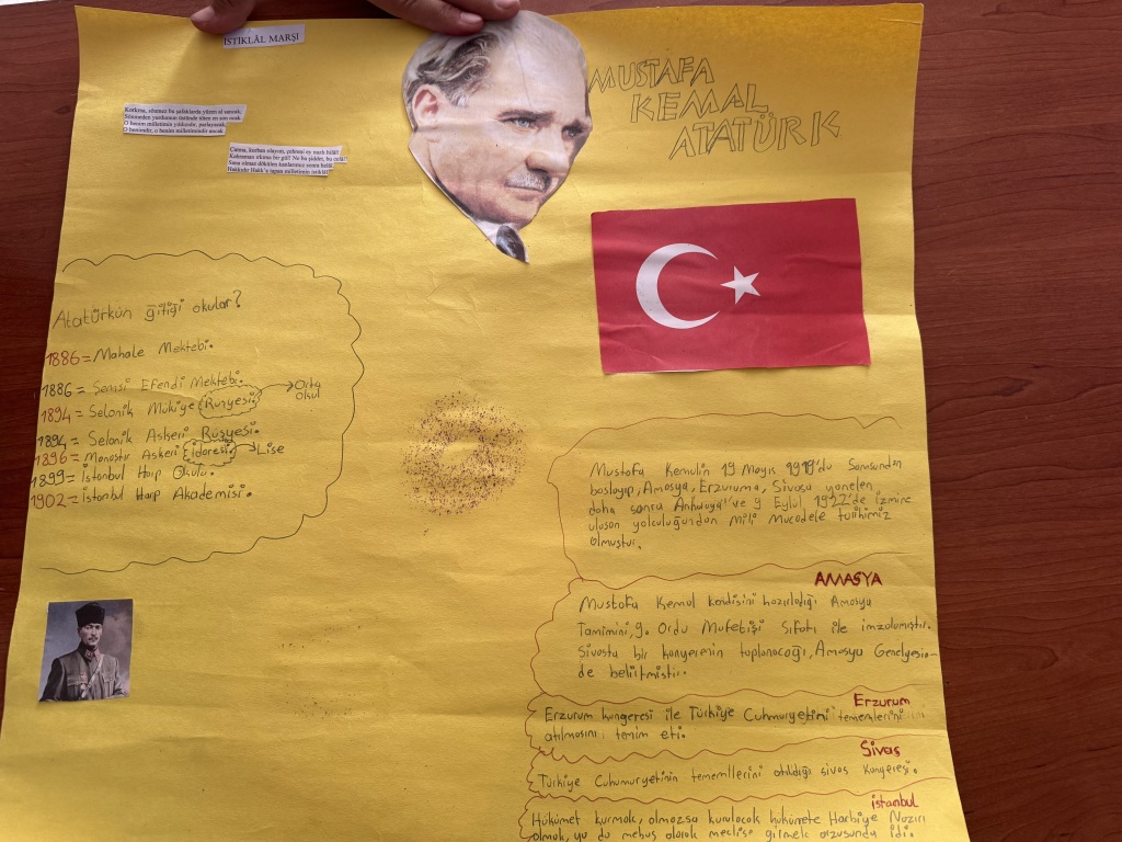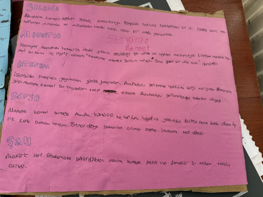 8/A sınıfı öğrencileri, T.C. İnkılap Tarihi ve Atatürkçülük dersi kapsamında “Mustafa Kemal’i etkileyen yerli ve yabancı yazarlar, yaşamını etkileyen şehirler ve öğrenim gördüğü okullar” konulu bir çalışma yaptı.