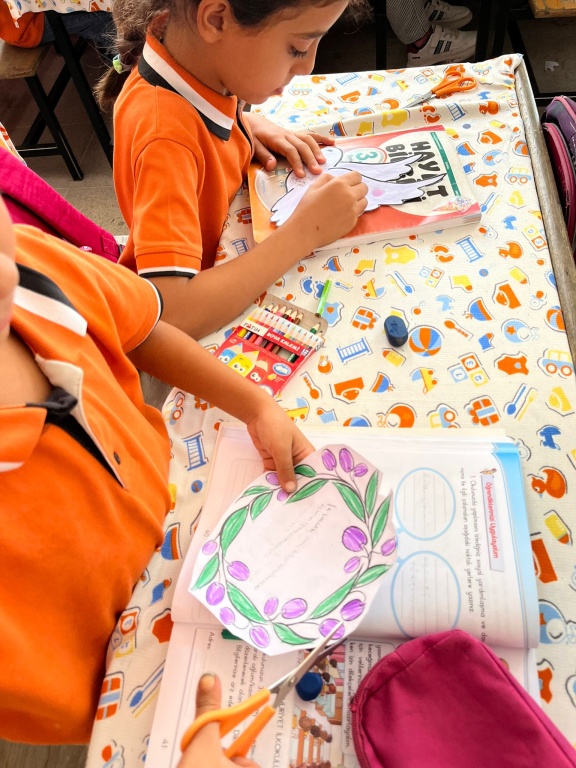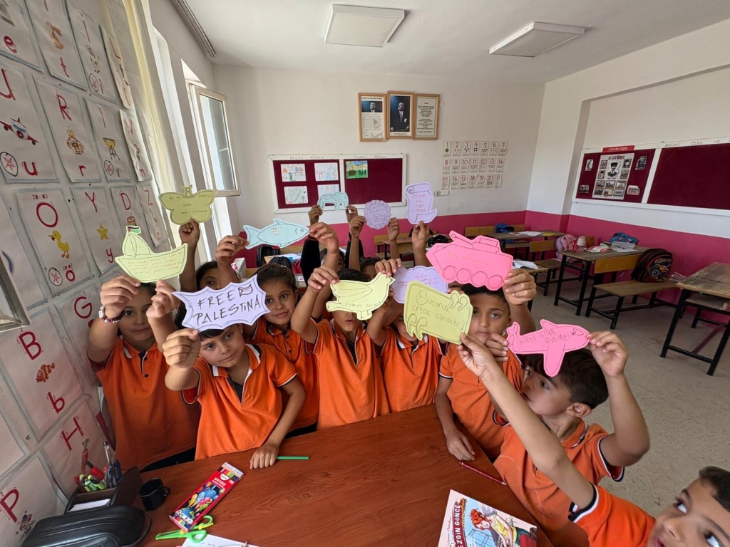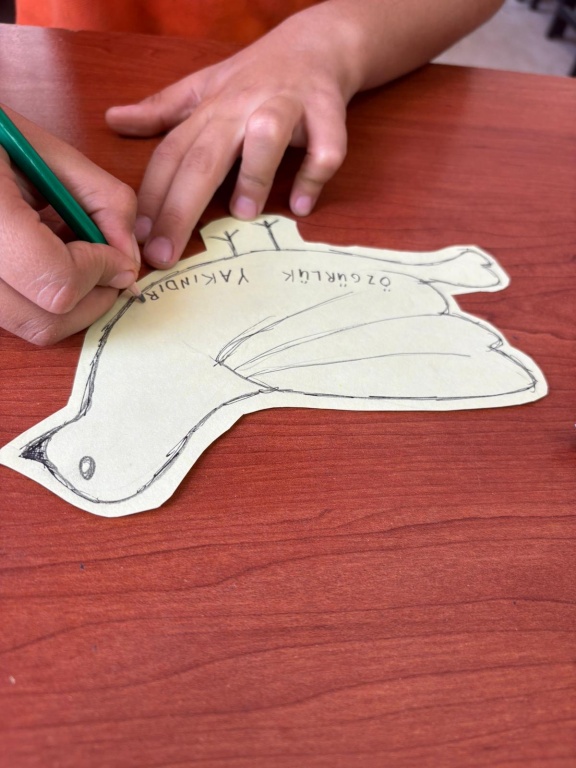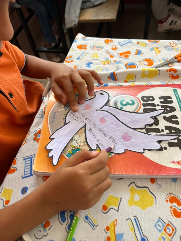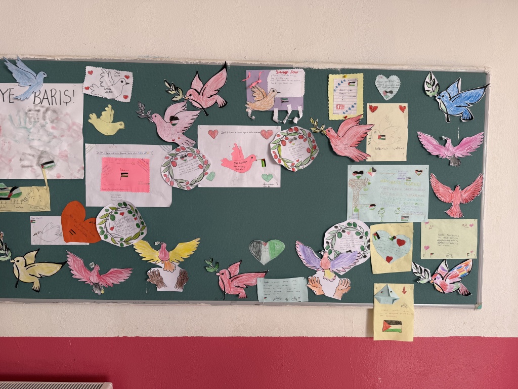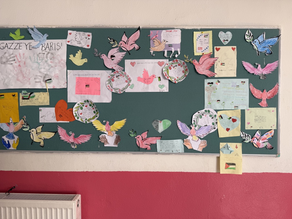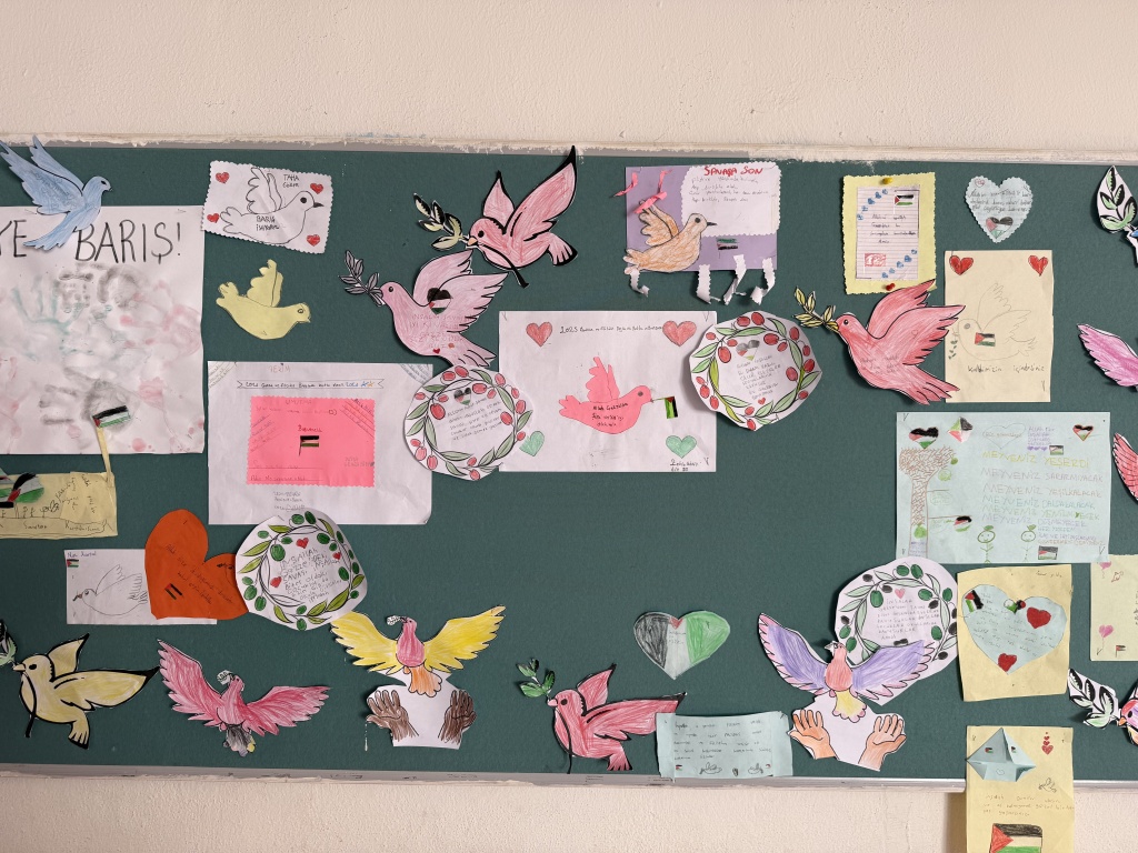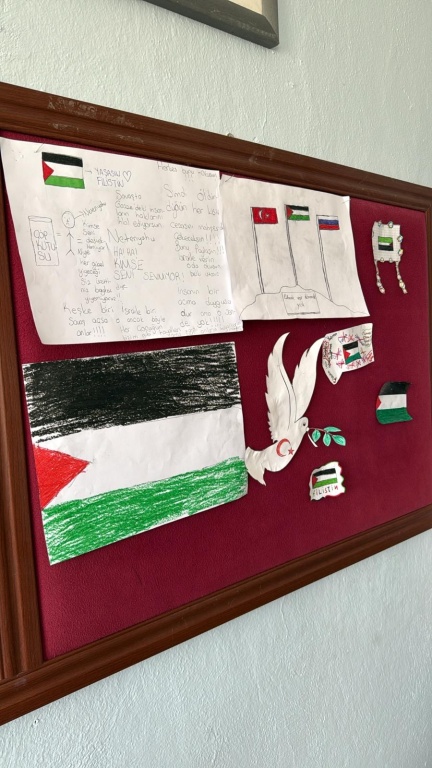 Etkinlik sonunda öğrenciler, “Gazze’ye Barış” temalı resim ve yazı çalışmalarını hazırlayarak duygularını ifade ettiler. Çalışmalar barış güvercinleri ve dostluk mesajlarıyla süslenen panoda sergilendi.
